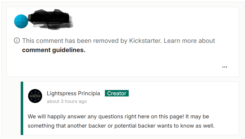 Dear Reader, I wanted to out him, and post something under his original comment on the site, but we don’t want to run afoul of Kickstarter’s policies. We're new to the platform, so I couldn't find anywhere to report this guy.